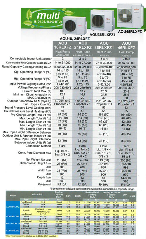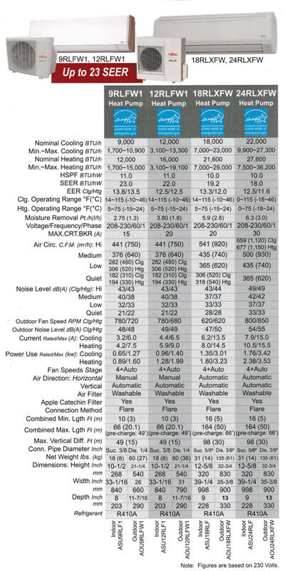 Fujitsu’s line of mini-split heat pumps come in different sizes, styles, and rated outdoor temperatures.